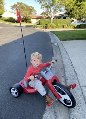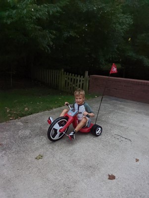 Grandson loves his new big wheel. The flag is a definite plus for visual sighting. The adjustable seat makes it fit as needed. It would be nice to have an optional heavier front tire but I do believe the lightness is part of the big wheel spin!