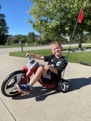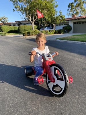 Radio Flyer provided me with a free sample to test and try out. We have owned a few big wheel bikes, my 4 year old likes to ride hard and has puts holes in tires from stopping fast. After a few weeks of riding hard and breaking fast, this bike has is still in great shape. Wheels are very durable thick hard okastic. Love that you can adjust the seat so my 4 year old and 7 year old can both ride. Easy to put together, instructions very straight forward. Flag comes on and off so you don’t need to have it on if you don’t feel the need. Would recommend this to anyone that has younger kids under 8 that like to ride fast and hard.