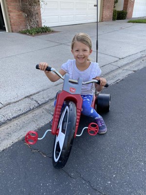 Radio Flyer provided me with a free sample to test and try out. The instructions for putting the tricycle together were simple, contained great illustrations, and the tricycle was assembled quickly. The suitable ages for the tricycle are 3-7 years old, however, my son who is 3 was disappointed as he was too short to pedal the bike. My daughter, who can ride a two-wheeled bike was surprised at how much fun this low rider tricycle was to ride. She loved the fact that it has a tall flag, chopper-style handle bars and it's low to the ground. Definitely a fun toy!