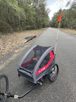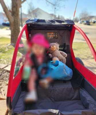 Radio Flyer sent this to me to test out, and for free! I have a 21 month old Son who just loves riding in it. It is super easy to put together which is very convenient. It would easily store in your trunk. I really like the add to a bike feature too. It has a mesh cover to protect your child and also a plastic cover for even more protection. There is even storage space which is awesome. There are also brakes on it. It is very well made and designed. I highly recommend this product!!