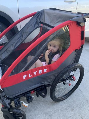 I received this product as a sample from radio flyer. My two year old loved it! We've only tested it as a jogging stroller but I liked it a lot, and I like that it can be used as both a bike trailer and stroller. One downside is the buckle is a little snug on my two year old, who weighs 30 pounds. I'm worried she'll outgrow it soon. If you have a very large toddler it might be hard to buckle them.