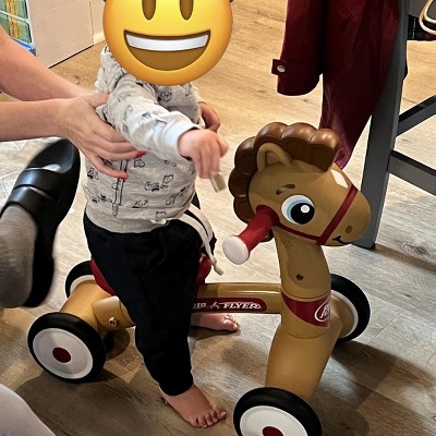 Cute and good quality, but my toddler doesn’t like the wide spacing of the front wheels. He is used to a balance bike, and the front wheels blocking his feet moving forward to propel this Pony really frustrate him. He barely plays with this at all.