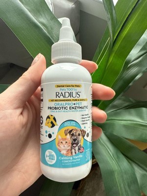 Dental Care For Pets Vet Recommended, Pure & Simple 4x Safe And Effective Gut Health Enzyme Power Fresh Breath Calming 4 Months Supply 1 Tiny Bottle = 4 Big Bottles Concentrated Certified B Corporation 150% More Uses* 75% Less Plastic* Women Owned™ Peta Approved - Cruelty-Free BPA Free Discover Our Clean & Green Mission Periodontal Disease is the #1 most common clinical condition in pets. Vets agree, at-home dental care is the best way to prevent dental disease. Probiotics Gut Health Supports gut health and freshens breath with safe probiotics. Enzymatic Oral Care Enzymes fight plaque and bacteria for clean teeth and gums. Fresh Breath Neutralizes bad breath and helps keeps mouths fresh all day. Calming Vanilla Soothing vanilla helps keep dogs and cats happy and calm. Crafted with care and safe, effective ingredients, our formula tackles dental concerns to keep your pet happy and healthy! RADIUS®: Woman-owned, family-run B Corp offering sustainable oral care - eco-friendly toothbrushes, toothpastes, and more. Made in the USA for better health and a greener world for you and your pets. *Compared to competing water additives.