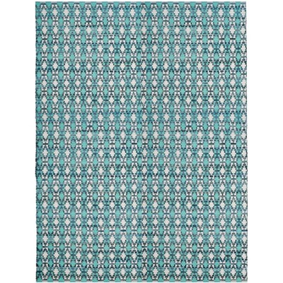 Elevate your living space with this exquisite hand-woven area rug, a quintessential blend of traditional craftsmanship and contemporary style. Sized generously at 9 feet by 12 feet, this large rectangular rug boasts a vibrant turquoise and multi-color palette that instantly brightens up any room.