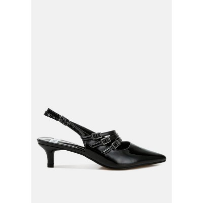 The one staple in every shoedrobe is a pair of versatile and stylish sandal. The triple strap on these slingback sandals elevates their visual appeal, seamlessly blending the sophistication of a kitten heel backstrap with the classic allure of Mary Janes. The short heel and comfortable cushion insoles offer a relaxed and comfortable fit. Type: Sandals Upper Material: Patent Pleather Outer Sole: TPR Closed Pointed Toe Kitten Heels Triple Strap Vamp Pin Buckle Slingback Fastening Comfortable Cushion Insoles Heel Height: 2 inches RCSH5198