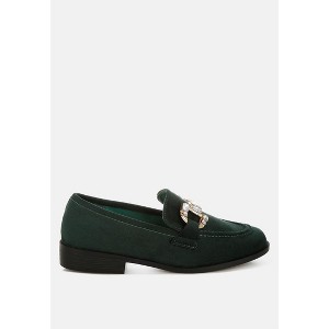The flat loafers are comfortable with soft cushion insoles and have a dashing aesthetic with the elegant yet bold diamante embellished horsebit detail which accentuates the overall appeal of the microfiber loafers. Type: Loafers Upper Material: Microfiber Outer Sole: TPR Closed Round Toe Low Block Heels Diamante Embellished Horsebit Detail Comfortable Cushion Insoles Heel Height: 1 inch RCSH4992