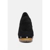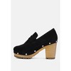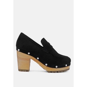 Handcrafted with fine soft suede leather, these heeled loafers is a chase! Stud lined detail on the rubber insole wooden clogs is all aesthetics. The organic cotton lining keeps feet at comfort and odour free, is comfortable and sets on feet curve just well! Type: Loafers Heel Type: Block Heeled Clogs  Closed Toe Slip-On Upper Material: Suede Lining: Organic Cotton Lining Out Sole: Processed Rubber Stud Detail Smart Casual Women's Shoes RCSH2959
