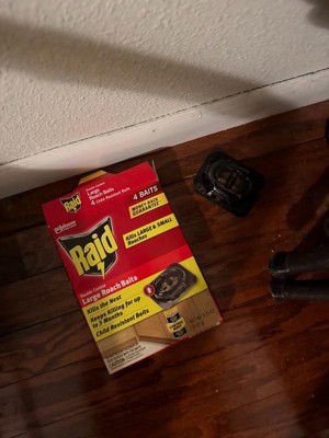 [This review was collected as part of a promotion.] The raid double control large roach baits are convenient. Two in one baits . We placed them in several rooms throughout the house. One by back door , one under refrigerator, one behind deep freezer and one in restroom. Places where the heat and humidity seems to attract them to. The bait kinds smell like peanut butter. So if you have little ones put them in back of cabinets and under appliances out of reach.