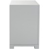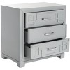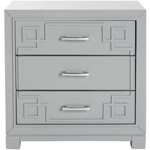 A fabulous display of modern sophistication, this Raina Three drawer Nightstand exudes chic couture style. Rainas classic Greek key pattern is paired with a sleek grey hue and polished chrome hardware for matchless fashion flair.