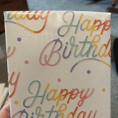 A: The design features a 'Happy Birthday' message in vibrant rainbow hues with colorful dots.