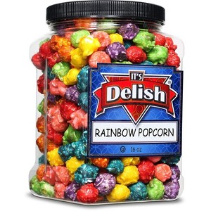 Gourmet Rainbow Colored Popcorn by It's Delish, 16 Oz Jumbo Container MADE WITH SPECIAL KERNELSOur Gourmet Popcorn is no ordinary popcorn. We use special popcorn seeds that yield larger and fluffier popcorn. Oh, and did we mention that we are strictly kosher and vegan too? In addition, these are air-popped and have 0% trans-fat. Stock up and enjoy!ENJOY LIFE WITH COLOR & FLAVORIt's Delish Rainbow Popcorn will keep you munching and crunching while you get to appreciate the fun fruity flavors and exciting colors of the mix. Whether at a carnival, fun party or just sitting at home or office, you"ll love our rainbow popcorn. Indulge today!FRESHLY POPPED AND CARAMALIZEDWe now produce our popcorn in-house with our world-class gourmet popcorn expert! First, the popcorn gets air-popped and not oil or kettle cooked. Then they get caramelized for their candy coating. Finally, they get packaged and ready to be shipped your way!About It's Delish!It's Delish was established in 1992 and is located in North Hollywood, California. It's Delish is a food manufacturer and distributor who produces over 500 gourmet food products including licorice, sour belts, taffies, caramels, Jordan almonds, chocolates, nuts, fruits, trail mixes, spices, and the spice blends. It's Delish also produces s and all natural products. We give you the opportunity to order from the factory direct!It’s Delish!™ prides itself on the four pillars that are at the foundation of everything we do.