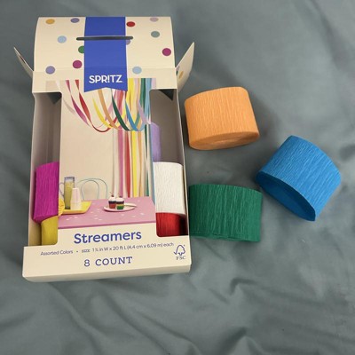 [This review was collected as part of a promotion.] This streamer pack comes with lots of vibrant colors. I would consider five of the eight rolls very bright/bold (hot pink, yellow, red, blue, green), with the lavender, white, and light orange being more subtle. The texture is unique in that they have an almost terrain/ridged texture. It would be nice if each roll was a little longer just to get a little more value for the pack. The packaging is may be a little fancier than I need for a pack of streamers. But all in all, a very nice product. I received an incentive to write this review.