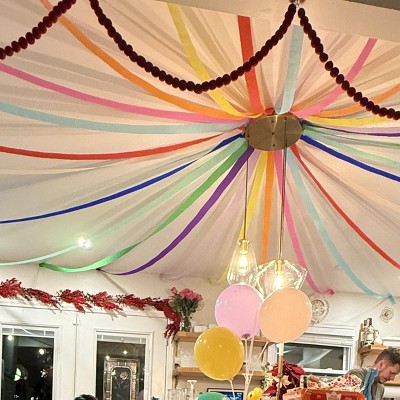 Very cute addition to a rainbow themed party! We just taped it up in an arch and then had the back coming down to the ground, it was so cute! It was very easy to attach it to the ceiling and it’s still up the next day.