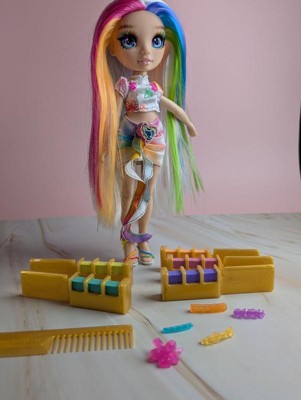 - WHAT'S INCLUDED. 11” Fashion doll with complete doll outfit and hair styling kit - 5 hair chalk combs, 5 washable hair chalk in rainbow colors, 5 hair clips. PRO TIP - WASH HAIR TO REMOVE STYLING GEL: When first unboxing doll, wash her hair thoroughly to remove styling gel and let hair dry completely. Then, her hair is ready to brush.