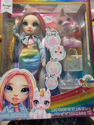 [This review was collected as part of a promotion.] My daughter absolutely loves this doll! We got the Amaya Raine doll and it’s supercute. The face is glittery and eyes are really pretty with purple and blue colors. And the long lashes are really cool. My daughter really likes the hair, rainbow dress and denim jacket. And there’s so many fun accessories and additions including shoes, handbag, comb, stand, and pet unicorn. Plus, there’s diy slime which was easy to make-just add water and shake in the crystal shaker (included). There was also glitter to add to the slime. My daughter really enjoyed making and playing with the slime. Though, the slime is on the sticky side and the glitter was a little messy.