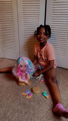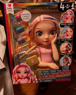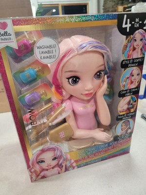 - STYLE IT! This 13” Bella Styling Head has beautiful long light pink hair with curls and is easy to create endless hairstyles. Use the included brush to create fun hairstyles like braids, ponytails, buns, and so much more. COLOR IT! It’s so easy to color her hair. Pick your favorite color (pink, blue, purple) and simply add it to the coloring tool. Then use it just like a straighter to add color to the hair. You can add multiple colors. And you can wash it out and do it over and over again.