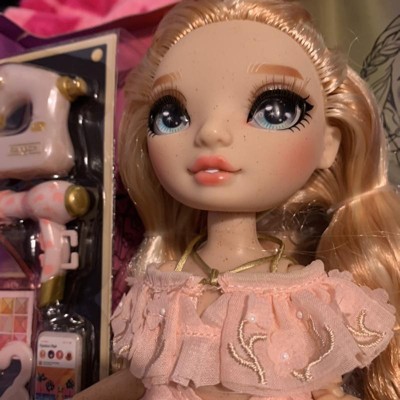 - GORGEOUS FEATURES: Victoria has a unique design and our first doll with freckles from head to toe. Victoria is so pretty dressed in a light blush Pink from head to toe. She expresses her own style in a matching ruffle top and skirt with pearl stud details, flower earrings, a pair of pink bow heels, and fun accessories. And she has beautiful, curled light pink, long hair, long real eye lashes and glass eyes.