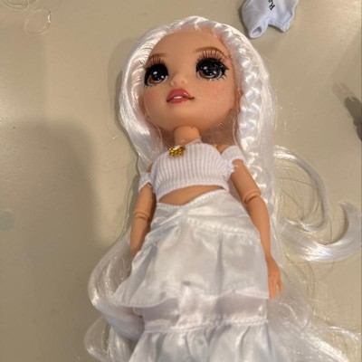 - BONUS FASHIONS: In addition to the Doll dressed in an all-white outfit (white colored top, white skirt with ruffles, and white heels), she comes with a bonus shirt and sneakers.