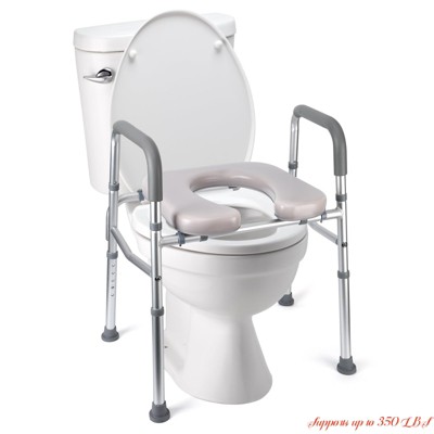 Raised Toilet Seat with Adjustable Height, Padded Seat Commode 350LB Capacity, Stand Alone Bathroom Assist Frame for Elderly, White