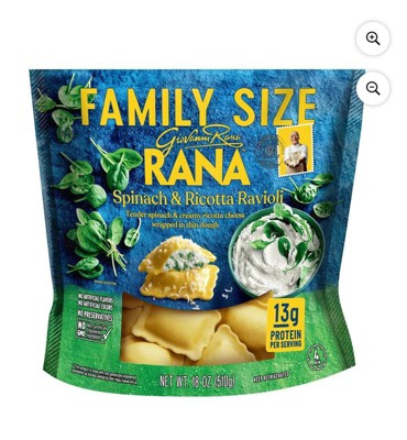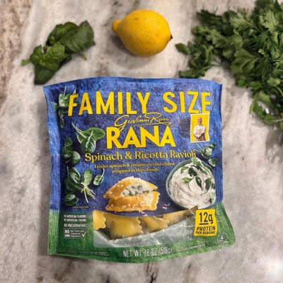 [This review was collected as part of a promotion.] Rana Family Size Spinach & Ricotta Ravioli offers fresh, tender pasta filled with a smooth blend of creamy ricotta and mild spinach. The ravioli cook quickly and evenly, with a soft yet satisfying bite that tastes closer to homemade than typical refrigerated pasta. The filling is well-balanced—not overly salty or heavy—making it versatile with marinara, Alfredo, or a simple butter and herb sauce. The family-size package is generous and convenient for weeknight meals, delivering fresh flavor, quality ingredients, and reliable consistency in every serving.