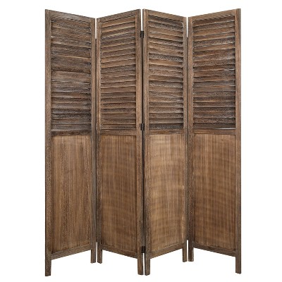 Rancho Shelf Four Panel Room Divider with a classic Louvered slat design. Made of Paulownia Wood in natural torch carbon finish, this panels will bring the vintage farm house feel to your house. It also come with three transverse removeable shelves for extra storage space on both side, plenty of space for potted plants, books and other décor. This item is not only a screen but also a storage unit. Product Dimensions (Max Extend) 47" W x 11" D x 67" H (Per Panel) 15" W x 67"