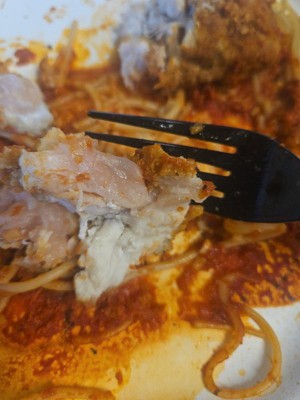 Cooked it In the oven like it says too the film came off pasta was burnt and stuck on the side of the container the cheese was not even melted chicken breading was gross there wasn't anything sauce really had to heat up some sauce and had to put into the microwave the whole thing was disgusting never ever again can't recommend stay away it's not worth the money not at all I was expecting it to be good really good cuz their sauce is good put that food in the chicken parm was disgusting now I have their meat lasagna in my freezer and I'm afraid to even bother to try it 10 thumbs down 👎👎👎👎👎👎👎👎👎👎😝🤦🧟