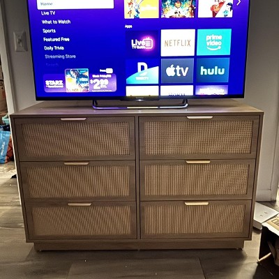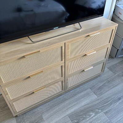 Rattan 6 Drawer Dresser, 47in Wide Natural Oak 6 Chest of Drawers with Metal Handles and Wooden Sturdy Base for Bedroom Living Room Nursery