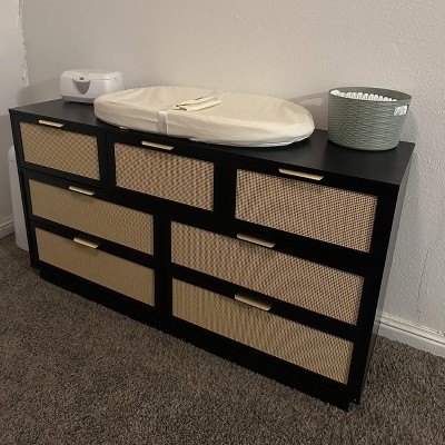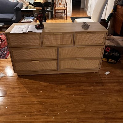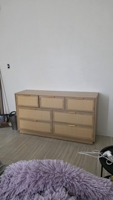 Rattan 7 Drawer Dresser, 55in Wide Natural Oak 7 Chest of Drawers with Metal Handles and Wooden Sturdy Base for Bedroom Living Room Nursery