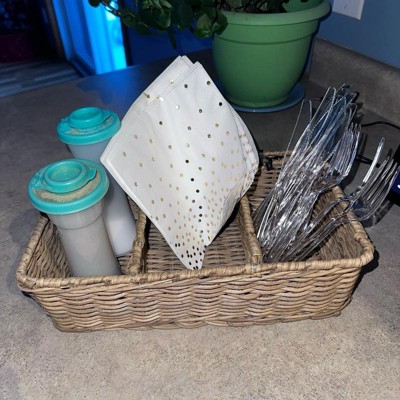[This review was collected as part of a promotion.] I originally bought this for my bathroom to store tissues and other items however the space in the basket didn’t provide enough space. I decided to put my napkins and party utensils in it for a family gathering and it worked great. It added a nice touch of texture to my counter and provided perfect storage. The basket is really well made and has an attached lid. I’m excited to see what else I can use this for.