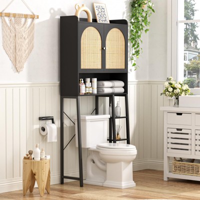 Rattan Over The Toilet Storage Cabinet with 2 Doors & Toilet Paper Holder Stand, Black