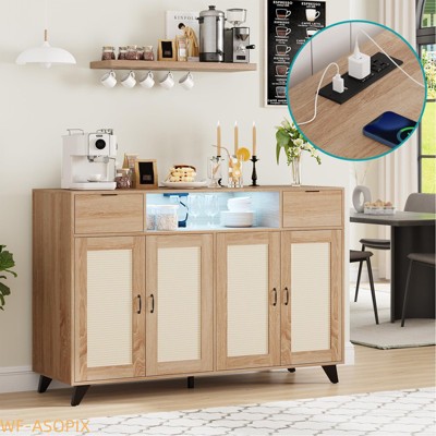 Bring timeless charm and smart function to your home with this rattan sideboard buffet cabinet. Featuring 4 rattan doors, 2 drawers, and adjustable shelves, it offers roomy storage for dinnerware, appliances, or d¨¦cor. A built-in power outlet with 2 AC plugs and 2 USB ports makes it the perfect coffee bar or media console¡ªpower your espresso machine, blender, or devices with ease. Crafted from sturdy MDF with elegant rattan accents, this versatile piece fits seamlessly in the dining room, kitchen, living room, or entryway.
