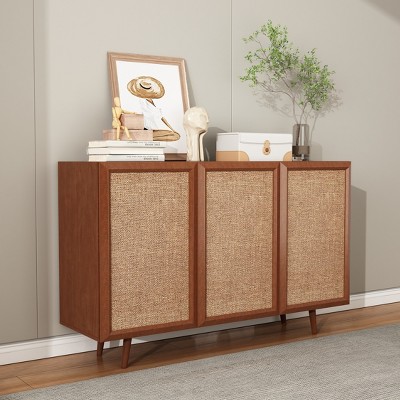 Rattan Sideboard Buffet Cabinet, Wooden Side Board Accent Buffet with Power Outlet, Wood Sideboard with 4 Doors
