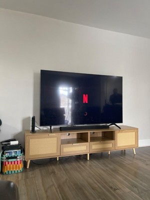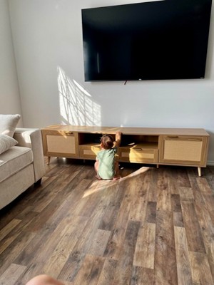 I'm totally in love with this TV stand! It's big, super sturdy, and made with really nice materials. The look is gorgeous-a wood tone with rattan doors that gives off both rustic and modern vibes. My TV fits on it perfectly, and it's completely upgraded my living room style. So worth the money!