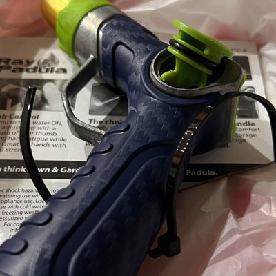 This all new, innovative Ray Padula Thumb Control adjustable hose nozzle is a perfect choice when looking for a high-performing, dependable nozzle season-after-season. By simply rotating the green adjustment ring, the watering pattern adjusts from a gentle mist to a powerful, blasting stream making it a great choice for all outdoor cleaning and gentle watering tasks. Best of all, this nozzle features Ray Padula Thumb Control! This unique design allows you to turn your nozzle ON, OFF, and completely adjust water flow with a simple push of your thumb, and without having to walk back and forth to the faucet. With no triggers to squeeze, dials to press, or buttons to click, say goodbye to hand fatigue and strain while watering – a great feature for hands with limited grip strength. You’ll also enjoy the premium all metal construction, and modern Comfi-Grip body design created to reduce hand strain and provide a slip-resistant grip while watering. The unique metal loop even allows for easy storage of your nozzle in the garage or shed while not in use.