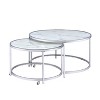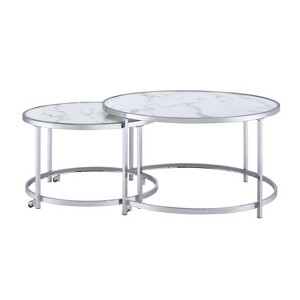 Experience an elegant interplay of flowing shapes and mixed media with the Rayne Nesting Cocktail Tables. Faux marble, glass and chrome combine to bring interest and multi-level dimension to any living area. The small nesting table features casters for easy access and mobility. A truly unique design for a stunning contemporary look. Also available in the collection is a matching end table (purchase separately). Your purchase includes one large cocktail table and one small cocktail table.