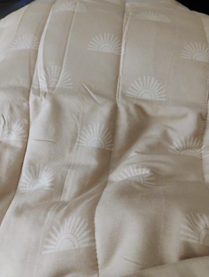 A: The blanket features an allover sun print on a quilted backdrop.