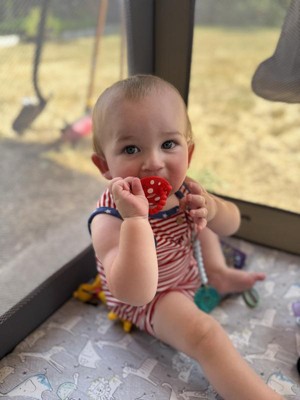 While this teether is adorable, it wasn't a win for my child. My kiddo gave up a pacifier several months ago, but I thought this would be a convenient shape for a teething toy that he wouldn't drop. However, he has no interest in keeping it in his mouth. This might be a great option for kiddos who still like to have a pacifier in their mouths and who also need a teether.