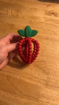 This is a great teething toy for our toddler. It's a fun bold color and size for her to hold. It has many ridges for her to bite on which she likes. I also think the different texture of the body and the green leaf part provides variety. The only downside is it's on the big side so we don't strap it to a stroller or take it on the go with us.