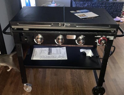 This product arrived Friday and took under 2 hours to set up, season and make a propane run. The negative 1) the top doesn't close properly as the hinges were bent during shipping. 2)The second burner from the left lights intermittently during start up. There is a weak looking spark when compared to the other burners. 3) you may need vise grips or similar to tighten the nyloc nuts on the wheel properly. One side tighten fine, but the other end stopped before going through the nyloc portion. The griddle top produced more then enough heat on its lowest setting across all 4 burners. When starting I'll turn the knows to mid range and then back them to low a few minutes later. The set up was quick. There was a loose burner that bounced off its mount that needed to be put back. 2 wheels along an axle to be placed, 2 handles that act as shelf bracing, and 4 knobs The griddle plate has an oil coating that comes of easily, I used dish soap and a garden hose to clean and then dried off the plate. I seasoned the griddle with avocado oil since it doesn't have a strong a flavor as olive oil. No complaints between bacon and pancakes on a flavor that doesn't belong. Clean up is quick while the griddle is still hot, the has a convenient drop right into the catch can. Once the top is cooled a quick wipe down is all that needed. - this is one feature that I liked over other brands I strongly recommend this product if your in the market for a flat top. If you can find this in a store GO FOR IT. you won't be disappointed. Even with the small issues I've listed its still a 5 star purchase