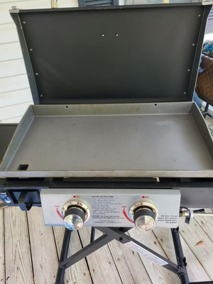 [This review was collected as part of a promotion.] This is such a awesome griddle. It has a large capacity cook top. It's large enough for multiple items to cook at once. Either a burger for supper or eggs for breakfast. This does all my families needs while out and about camping or picnicking. It was pretty much together when we opened the box. Had to attach two wheels and two knows which came with screws and a wrench to use. Has what you need to use a one pound propane tank or a twenty pound propane tank. The choice is ours. So convenient that it has wheels to pull and load it and take wherever we need it. Great option is that it also has a locked lid that keeps it shut while moving it or just storing it. Also a very large print manuel included.