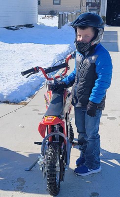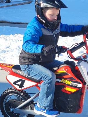 [This review was collected as part of a promotion.] I selected this Razor dirt bike for my grandson, and - gosh, was he surprised. He calls it his “precious motorcycle” and caught on within the first 20 minutes of use! It is a substantial electric powered dirt bike with excellent safety features. Its throttle is easy to use with front and rear handbrakes (adjustable) that stop the bike immediately. The dirt bike does also come to a slow stop by simply releasing the throttle, of which - was a helpful feature as my grandson got his bearings learning to maneuver and ride. Disclaimer: Be cautions to keep your hand off the throttle until you have mounted the bike safely and are ready to ride, it can be sensitive. The bike was easy to assemble and came with all the required tools and necessary parts. Instructions and manual were easy to follow. The kick stand holds the bike firmly in place while charging and is easy to “kick-up” and “kick-down.” This bike is great for both young and old riders, if they know how to handle it properly. The bike is 46.5 x 13.7 x 26 inches large and weighs in at 112 pounds of steel, it is very well made and durable. The motor is a 500-watt high torque electric motor. This bike is powered by a 36V battery which can last up to 40 minutes of ride time before needing to be recharged. The manual indicates the bike needs to plug in and charge for 12 hours to obtain a full battery life; however - we did not find this to be the case. The dirt bike was fully charged within about 2 1/2 hours; moreover - said charge proved to hold up wonderfully without any issues. I especially enjoy the long charging cord, making it easy to charge via either long or short distances to designated electrical outlets. The weight limit is 175 pounds. It can reach the maximum speed of 15 mph, which - is fast! The tires are large and make the ride comfortable riding through our mid Wisconsin winter snow- and ice-covered sidewalks/trails with ease. Puddles were no match either! And, as stated previously - the brakes are very responsive and will make the bike stop immediately. With the overall build of the bike, added shocks and tires - this bike handles both sharp and wide corners with ease. My grandson is excited to continue to master his new “precious motorcycle” (as he calls it… ). The Wisconsin spring and summer will bring great opportunities to ride through the woods, mud, rocks, gravel, puddles and more! Great dirt bike, excellent quality already bringing wonderful fun and memories to our family!