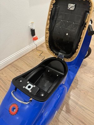 [This review was collected as part of a promotion.] This scooter is a ton of fun! My son loves it (and so do I!) This scooter is powerful and feels like a real scooter, but caps out at 15mph, so perfect for older kids. It was easy to put together and plugs right into a standard outlet. The battery holds a charge that lasts for between 30 minutes and an hour, depending on how it is being used. The seat lifts up to provide a pretty spacious storage space. All in all, this is a really fun toy.