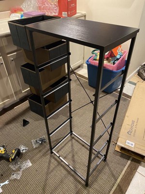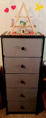 [This review was collected as part of a promotion.] I recently set up the Vertical Narrow Metal Tower Dresser w/ 5 Fabric Drawer Bins in my children’s play room and it is a fantastic way to help them Keep organized. We placed labels on all of the drawers to help them remember what goes in each drawer. The assembly process only took about 20 minutes and was easy.
