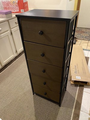 REAHOME 5 Drawer Vertical Steel Frame Storage Organizer Narrow Tower Dresser with MDF Top, Adjustable Feet, and Wall Safety Attachment, Espresso