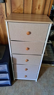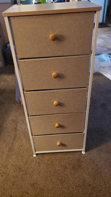 [This review was collected as part of a promotion.] The REAHOME Vertical Narrow Metal Tower Dresser adds a beautiful touch to my bedroom. The 5 Fabric Drawers are sturdy and are appealing to the eye. The drawer pulls are made of wood. The unit is metal and can attach to wall in the back so it's more secure. I am keeping bed sheets and comforters in mine. Plenty of room for whatever I'd like to put inside. I assembled in about 30 minutes.