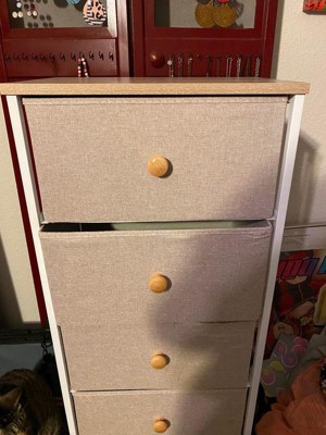 [This review was collected as part of a promotion.] This is a great small vertical dresser . It works great for smaller spaces . It is great for clothing and could be used for craft rooms as well . It is sturdy and the drawers seem to hold stuff well without caving in . It is so easy to put together and comes with everything you need for assembly .The look of it is nice as well .