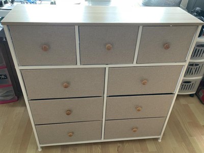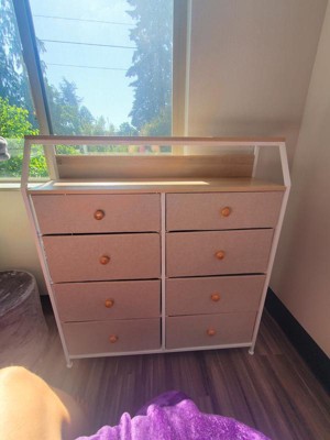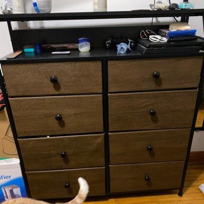 [This review was collected as part of a promotion.] I am very pleasantly surprised and pleased with the quality of this eight drawer wood top dresser. They look great and stylish with the rest of my bedroom furniture pieces. The top two drawers included separations for your undergarments. The fronts are wood and the actual drawers are those heavy duty cloth like boxes. They withhold my underwear’s and bedwear. I am impressed with the weight it withholds and the looks. It is nice.