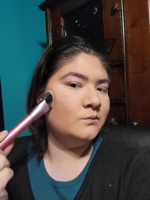 [This review was collected as part of a promotion.] I only have cream blush and powder bronzer on in this pic but the brush is hands down the best affordable brush i have ever used, its fantastic at applying and blending out powder, cream, and liquid. Very soft and sturdy brush, well constructed lightweight design.