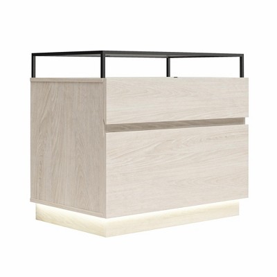 With the RealRooms Devon 2-Drawer Nightstand, even your favorite novels and phone charger will feel like they're living in the lap of luxury, adding a touch of class to your nightly routine. Featuring a sleek, clear, tempered-glass top display with a wooden surface beneath, this bedside table is designed to impress. The two drawers, one small top drawer and one larger lower drawer, offer ample storage for your essentials. The recessed base is adorned with LED strips that emit a warm white glow on the ground below, creating a cozy ambiance. Crafted from durable engineered wood, clear tempered glass, and a powder-coated steel frame, this modern nightstand for bedrooms promises enduring quality and timeless appeal. The LED nightstand ships in one box and requires assembly by two adults. 5V USB adapter not included. Once assembled, the night table measures 29.6" W x 26.5" H x 19.7" D. Discover the full range of bedroom items in the Devon collection to craft a sanctuary that reflects your style.