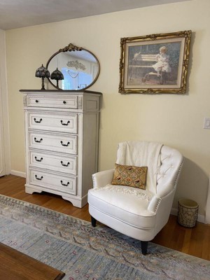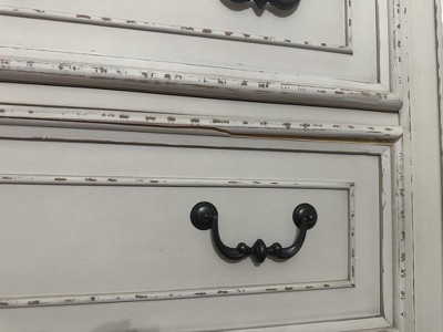 Elevating the art of traditional cottage styling, this chest of drawers is your dream bedroom retreat realized. Antiqued two-tone aesthetic blends a chipped white with a distressed wood finished top for added charm. Framed drawer fronts and decorative corbels add refinement, while bail pulls in a dark bronze-tone finish lend a classic touch. Signature Design by Ashley is a registered trademark of Ashley Furniture Industries, Inc.